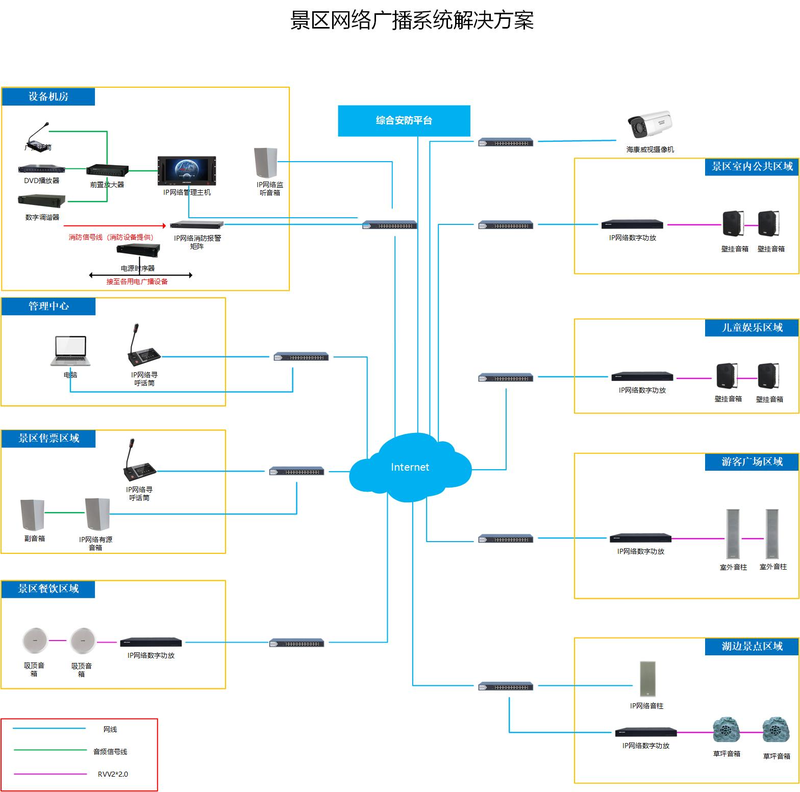 景區(qū)IP網(wǎng)絡廣播系統(tǒng)主要承擔了應急指揮調(diào)度、日常與應急廣播、危險警戒提醒、游客求助通話,背景音樂播放等功能。設備機房配置IP網(wǎng)絡管理主機、廣播話筒等實現(xiàn)對景區(qū)所有設備的統(tǒng)一管理。管理中心部署IP網(wǎng)絡尋呼話筒等設備,實現(xiàn)對景區(qū)各分區(qū)的實時監(jiān)管遠程喊話。在售票區(qū)、餐飲區(qū)、兒童娛樂區(qū)、室內(nèi)外公共區(qū)域等不同分區(qū)配置所需廣播設備,并將攝像機與廣播系統(tǒng)同時接入4200平臺,實現(xiàn)音視頻聯(lián)動,更高效管理景區(qū)。